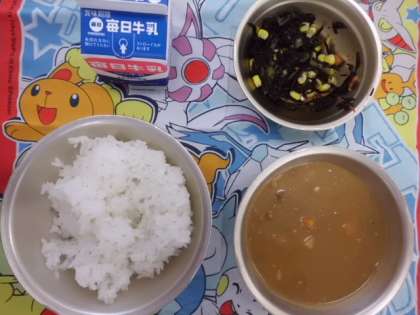 「ごはん,牛乳,カレー,ひじきのソティ」