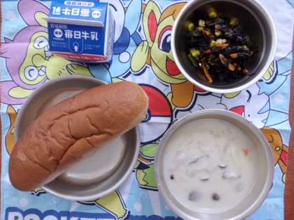 「黒糖コッペパン,牛乳,きのこのクリームシチュー,ひじきのソティ」