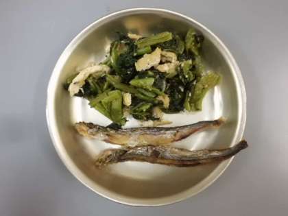 ししゃものからあげ,青菜の中華風いためもの,わかめスープ」