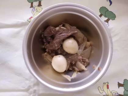 牛肉,エリンギ,まいたけ,玉ねぎ,うずら卵,チンゲン菜を炒めて,