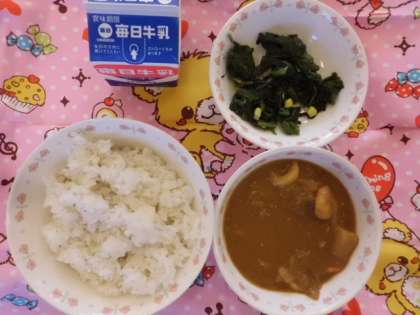 「麦ごはん,牛乳,シーフードカレー,ほうれん草のソティ」