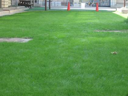 雨上がりの朝の芝生のみどりが目にまぶしく,