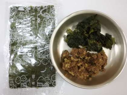肉みそ納豆,手巻きのり,ほうれん草のおかか煮,キャベツの吉野汁」