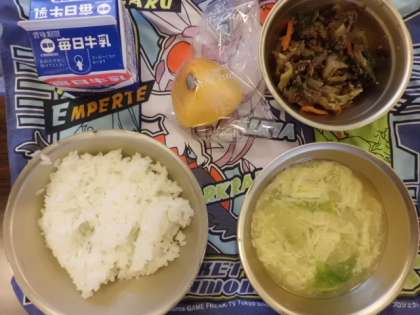 「ごはん,牛乳,プルコギ,レタスと卵のスープ,柿」