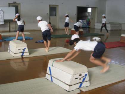 3年生は体育の学習でマット運動に取り組んでいます。今日は体慣らしの準備運動として「ねこちゃん体操」をしました。体を丸めたり,伸ばしたりして,子猫のように体を動かしブリッジ・・・バランス・・・と,マット運動を楽しみました。体が柔らかくなったところで,腰を高く上げるための「山とび」に取り組みました。マットを敷きつめてグループで一緒に技をするミニ床運動にも挑戦し,大盛り上がりの時間でした。