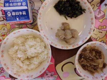 牛丼の具,ほうれん草のおかか煮,里いものごまみそ煮」