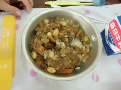 給食カレンダーで食べ方を確認して麦ごはんにかけて食べてくれていました。