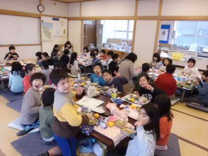 ランチルームで一緒に給食を食べました。