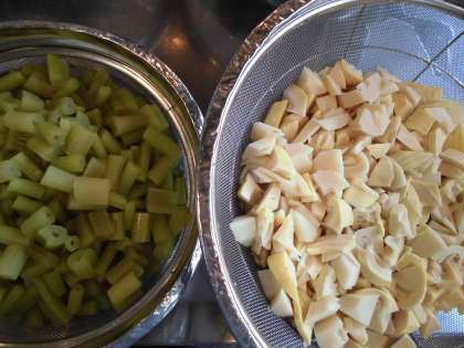 なま節を煮つけた煮汁を使って,ふきとたけのこを煮含めました。