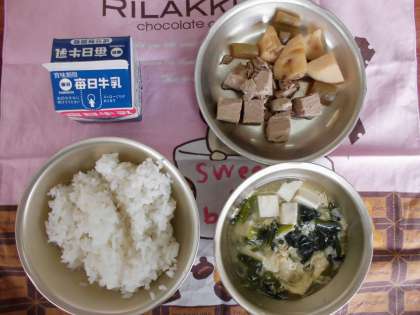 「ごはん,牛乳,なま節とふきの煮つけ,かきたま汁」