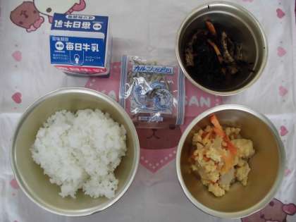 「ごはん,牛乳,親子煮,ひじきの煮つけ,じゃこ」