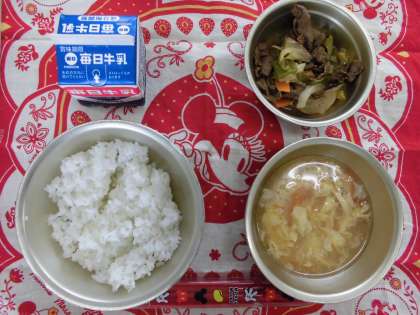 「ごはん,牛乳,焼肉,トマトと卵のスープ」