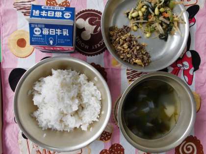 「麦ごはん,牛乳,ビビンバの具,わかめスープ」