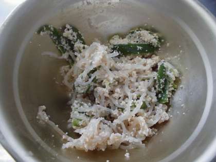 せん切りにしたピーマンと糸こんにゃく,たらこを炒めて