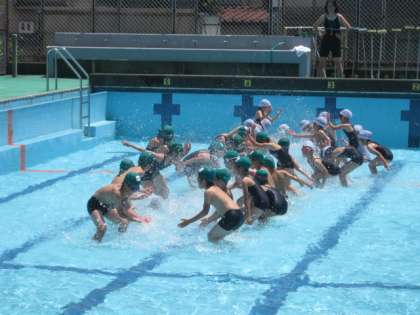 今日は,1・2年生のみずなれの2日目でした。晴天で大変 暑く,みんなプールの水に浸っているのが心地よさそうでした。水のかけ合いのあと,いろいろな動物になって水中を歩きました。ワニ歩きでは,ときどき顔をつけることもしました。2年生が上手に見本をしてくれたので,1年生は俄然やる気になったようです。「顔をつけるのが苦手〜。」と言っていた子も,全員が1度は顔つけできていました。すごい!