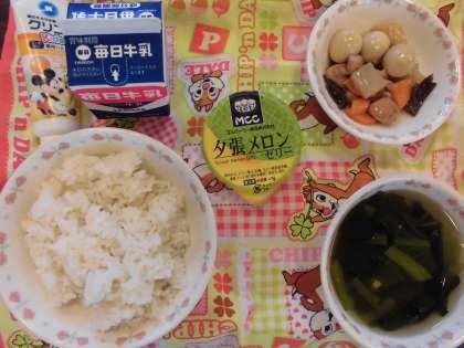 「麦ごはん,牛乳,プリプリ中華いため,とうふと青菜のスープ,メロンゼリー」