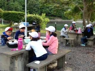 潮風香る野外での食事は食欲をそそるようです。みんな