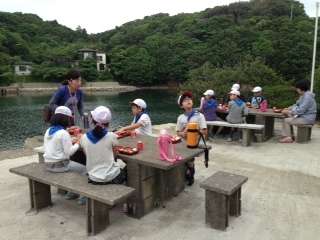 朝食のようすですが,深谷水道からの潮風が心地よさそうですね。