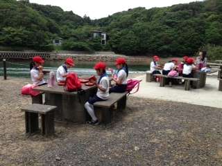 潮風香る野外での食事は食欲をそそるようです。みんな
