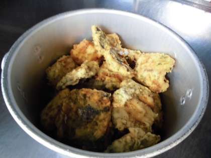 さわらにパセリ,バジルの香草を使った衣をつけて油で揚げました。