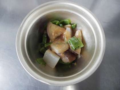 賀茂なすと万願寺とうがらしとこんにゃくを油で炒めて,