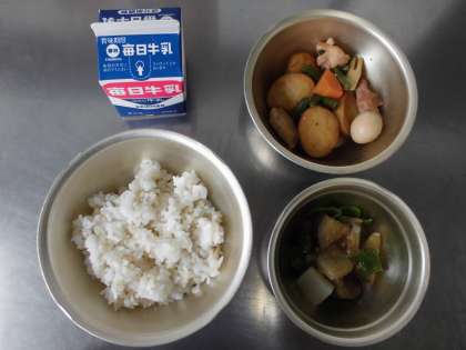 「玄米ごはん,牛乳,平天の煮つけ,京野菜のごまみそかけ」