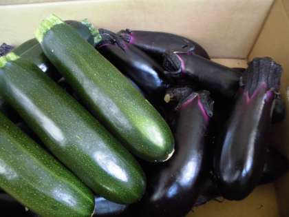 今日の給食では,夏野菜のズッキーニとなすを使いました。