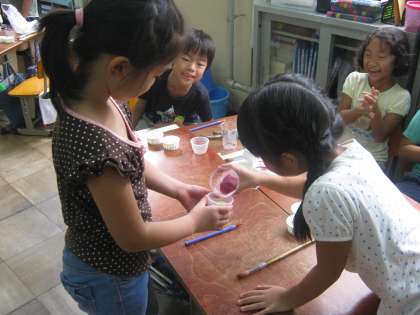 アサガオの色水に加えて,ヒマワリからとれた黄色の色水,マリーゴールドからとれた山吹色の色水,ケイトウからとれた濃いピンク色の色水も使いました。「花を浮かべたい。」「色を混ぜたい。」と,子どもたちは何種類もジュースを作りました。担任から,青色と白色の絵の具を貸して,ミルク入りジュースもできました。ジュースを作ったあとは,「いらっしゃい!いらっしゃい!」と互いのグループのジュースをあげたりもらったりして,とても楽しそうに盛り上がっていました。