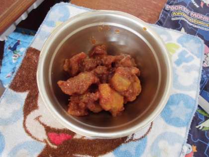 作ったソースに片くり粉でとろみをつけて,揚げた鶏肉をからめました。