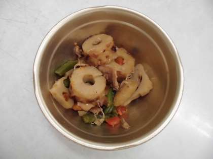「筑前煮」には,季節の野菜のれんこん,ごぼうを使いました。