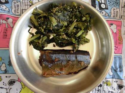「麦ごはん,牛乳,さんまのしょうが煮,だいこん葉のごまいため,みそ汁」