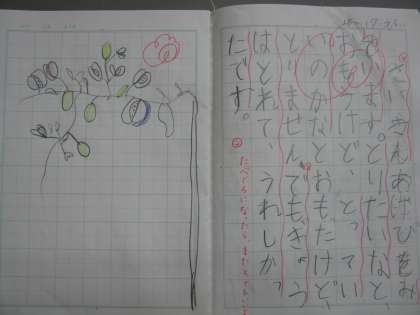 昼休みにみんなで飼育委員さんの仕事を見ていると,ある子が「きのう,学校のアケビを拾ってね…」と。アケビなんてどこにあったかな?,みんなで見に行こう!となりました。アケビは畑の近く,校舎裏になっていました。熟したものはパカッと開いて,あま〜い。教えてくれた子は,塀にひょいっとよじ登っていくつも取ってくれました。昼休みにはオクラも拾い,割ってみると真っ黒の種ができていました。休み時間終わりのチャイムをみんなで聞き逃していたので,あわてて掃除するはめになりましたが,大発見の昼休みになりました。(アケビ第一発見者が,基礎基本の時間に書いた5分間作文も載せます。)