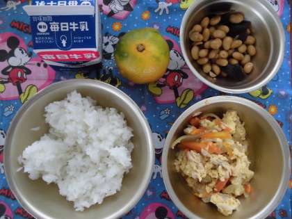 「ごはん,牛乳,親子煮,こんぶ豆,みかん」