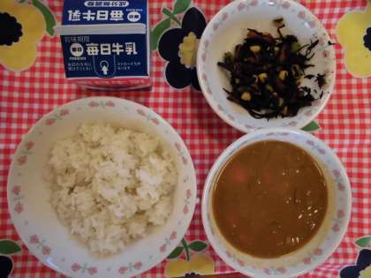 「麦ごはん,牛乳,カレー,ひじきのソテー」