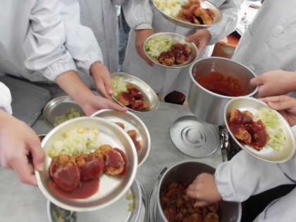 今日は,ヒレカツにソースをかけて,ソテーものせてと