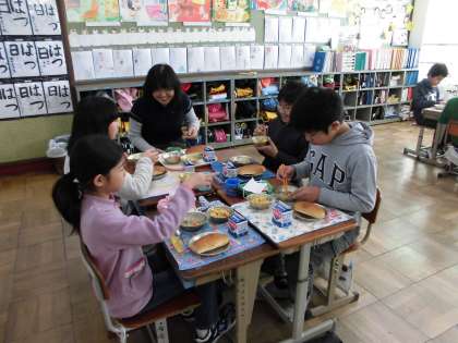 今日は,4年生が支援員の先生と一緒に給食を食べました。