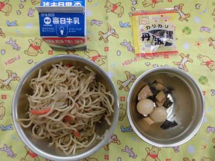 「塩焼そば,牛乳,うずら卵ときのこのいためもの,黒大豆」