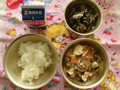 「ごはん,牛乳,五目どうふ,ほうれん草ともやしのいためナムル」