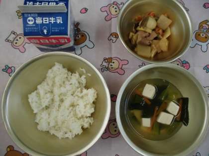 「麦ごはん,牛乳,プリプリ中華いため,とうふと青菜のスープ」