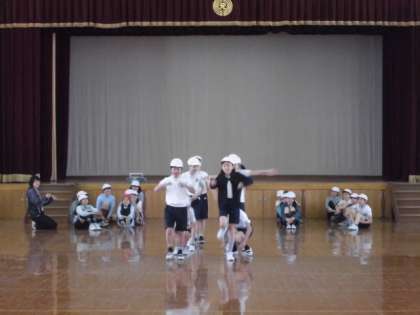 体育館では6年生が“ピタゴラスイッチ”体操をして