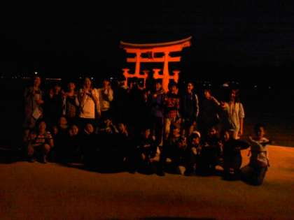 買い物タイムの帰りに,夜の厳島神社の鳥居をバックに記念撮影です。