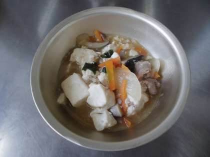 豆腐以外に豚肉,玉ねぎ,人参,しょうが,干しいたけなどを