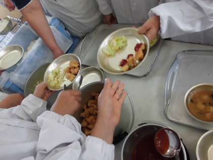 給食室でお肉に衣をつけて揚げた「チキンカツ」は,