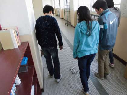 手回し発電機で作った電気をためてミニカーを走らせました。子どもたちは,発電機を回す回数や強さを調整しながら,廊下まで出て行って,長い距離を走らせることを試みていました。
