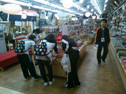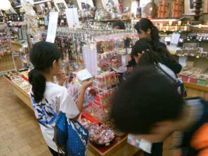 夜はお楽しみの買い物です。宮島には参道沿いにたくさんのみやげもの店が並んでいて,品定めもたいへんです。グループで行動して家族への大切なおみやげを買っていました。