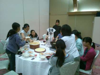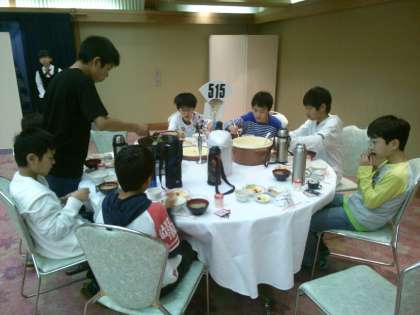 ホテルで熱々のしじみの味噌汁をはじめとした、様々なおかずで朝食を食べています。若干眠そうな人もいるようです。