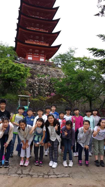 厳島神社の五重塔の前での集合写真です。