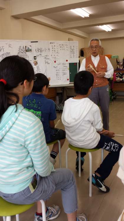 宮島でしゃもじ作りの体験をしています。作り方をしっかりと聞いています。宮島の伝統工芸のすばらしさや奥深さを感じてほしいものです。