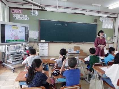 本校では6月9〜12日に「歯の衛生週間」を設けています。その時に,歯科衛生士さんによる歯みがき指導やいつもの歯みがきをよりがんばるように,歯みがきがんばり表を付けたりして,自分の歯に関心を持ち,歯や口によい生活習慣が身に付くように学習します。歯の衛生週間に先立って,ほけんの日に各学級で担任による保健指導を行いました。5年生では「歯ぐきの病気とその予防」。歯肉炎がすすんでいく様子をテレビ画面で説明を受けた後,自分の歯ぐきが健康かをチェックし,歯肉炎にならないために自分ができることを,学習プリントに書き込んでいます。