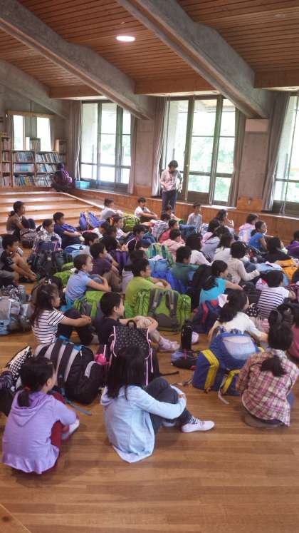 山の家につきました。雨が降っているので館内で入所式・旗揚げをしています。